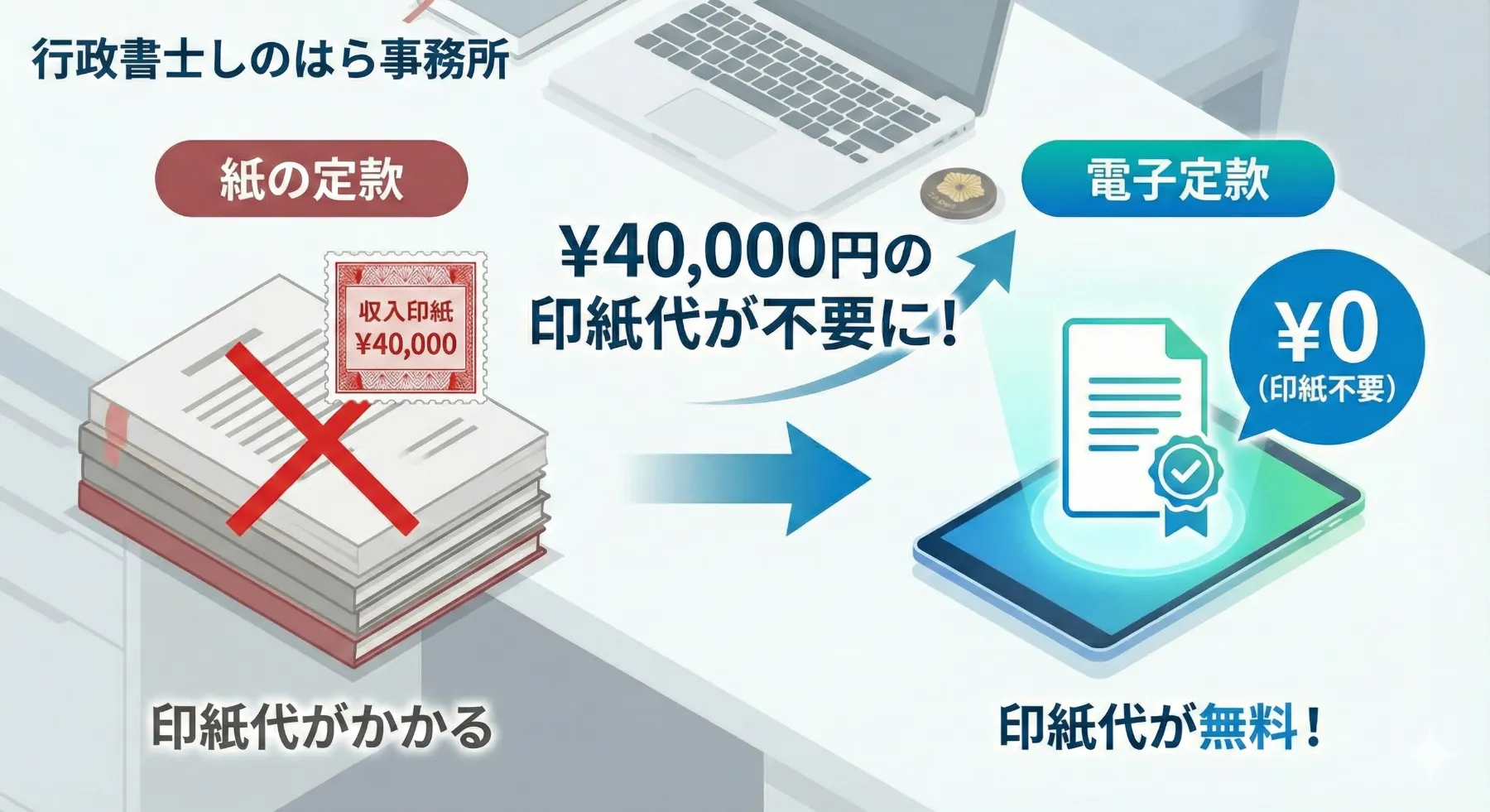 通常紙で定款を作成すると、収入印紙代として4万円がかかります。しかし、これを電子データで作成する「電子定款」にすることで、印紙代が免除されます。